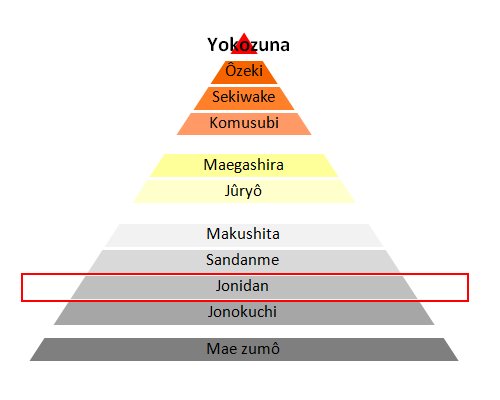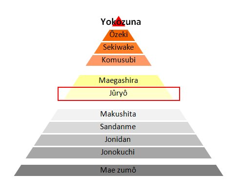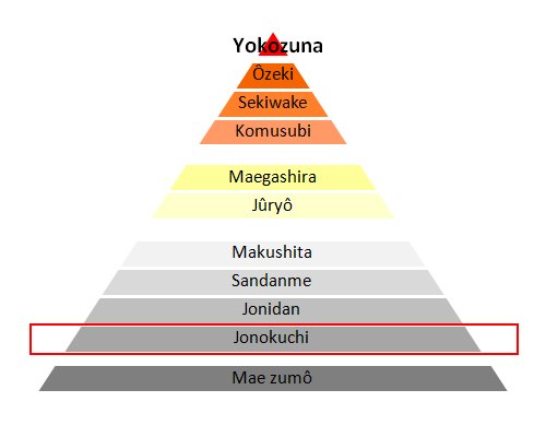 jonidan (序二段) : Catégorie de lutteurs apprentis de second rang jonokuchi (序ノ口) : Catégorie de lutteurs apprentis de première division jungyô (巡業) : Tournée d’exhibition organisée entre les tournois réguliers. Ils aident à recruter de nouveaux lutteurs et permettent au public de voir les lutteurs de plus près. Les résultats des jungyô ne sont pas pris en compte dans le livre officiel. jun-yûshô (準優勝) : Lutteur en course pour le titre de vainqueur du tournoi (yûshô). jûryô (十両) : Deuxième division des lutteurs professionnels de Sumô. Avec les makuuchi, elle constitue les sekitori. Elle est composée de trente hommes. |