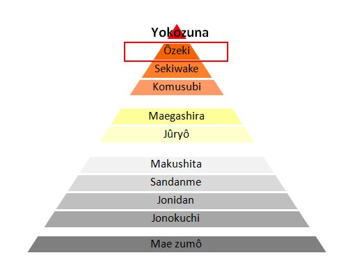 ô-ichô-mage (大銀杏髷) : Cheveux arrangés en un chignon élaboré en forme de feuille de ginkgo des lutteurs de la division sekitori (jûryô et makuuchi) ; utilisé uniquement pendant les tournois et les grandes occasions. oshi-zumô (押し相撲) : Style de combat s’appuyant sur l’expulsion hors du dohyô en utilisant le poids du corps, souvent employé par des lutteurs très lourds. oyakata (親方) : Maître de sumô ; ancien rikishi chef d’une heya ou simplement formateur des jeunes lutteurs (comment devenir oyakata) ôzeki (大関) : Grand Champion (Grande barrière, littéralement), rang venant après le yokozuna et avant le sekiwake. Il est nommé par la fédération mais peut quand même être rétrogradé si ses résultats sont insuffisants. |