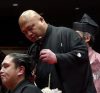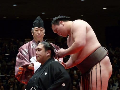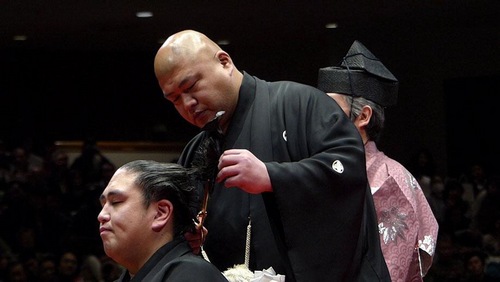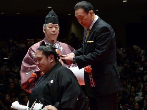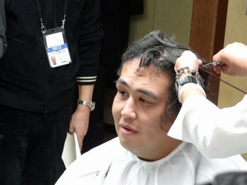 Miyabiyama, qui a pris le nom d’entraîneur Futagoyamaaprès sa retraite le 24 mars 2013 juste après le tournoi d’Osaka, a été salué par pas moins de 270 personnes qui se sont succédées tour à tour pour lui couper une mèche avec les ciseaux d’or avant que ce ne soit Fujishimaoyakata qui vienne clore le défilé en donnant le dernier coup.
