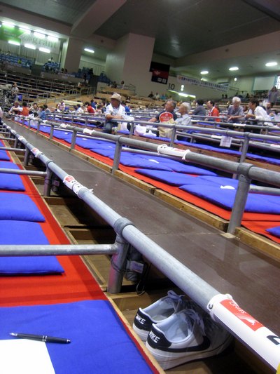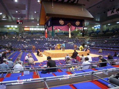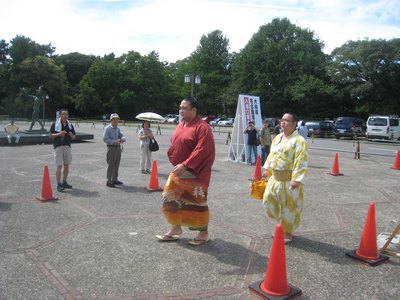 Le basho de Nagoya a ceci de particulier que sa situation géographique participe d’une ambiance unique. Bien que situé en plein cœur de la 4ᵉ ville du Japon, le gymnase a été construit au sein du parc du château de Nagoya. Après avoir longé le parc, puis franchi douve et muraille, on accède à l’entrée d’une grande esplanade. De part et d’autre les fanions multicolores des rikishis tranchent sur le ciel bleu, et au milieu de cette grande place cernée d’arbres et de « vieilles » pierres, le gymnase. Et même si le bâtiment en lui-même n’a pas d’intérêt architectural particulier, s’extraire de l’urbanité tourbillonnante de ce quartier de bureaux et d’administration pour rejoindre le lieu des combats offre au spectateur une forme de sas de décompression, qui participe de le mettre dans l’ambiance : laissons tout le reste derrière nous, maintenant place au sumo !