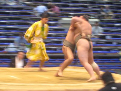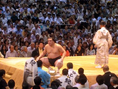 Certains rikishi « travaillent » d’ailleurs un peu le public : Asahishô lance le sel trèèèès haut, ce qui provoque applaudissements et exclamations du public, ou encore le populaire Kotoshôgiku, qui amuse le public.