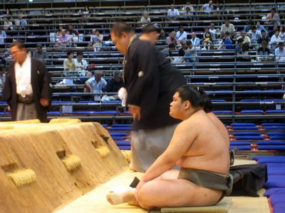 Et les combats, dans tout ça ? Voir les rikishi s’affronter sous ses yeux est évidemment incomparable avec les retransmissions de la NHK. C’est aussi un bon moyen de mesurer la cote d’amour des lutteurs. Parmi les populaires, on remarquera ainsi Tanzo, Osunaarashi, Hômashô, Tenkaiho, Kotoôshû, Tamaasuka, Tochiôzan… Hors-catégorie, bien bien sûr Kisenosato (bien plus encouragé que Harumafuji… et qui d’ailleurs gagnera son combat contre le yokozuna), Hakuho… et plus étonnant, Ikioi! Le lutteur d’Osaka ayant même son fan-club, avec un « chant » à sa gloire.