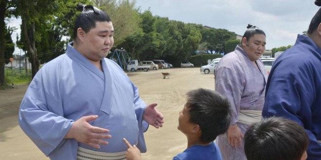 Shodai went into the ring and answered questions from children during a visit to the town of Mashiki, severely hit first by a magnitude-6.5 temblor on April 14 before the main M7.3 tremor two days later that left 49 dead and one missing in the prefecture in southwestern Japan.