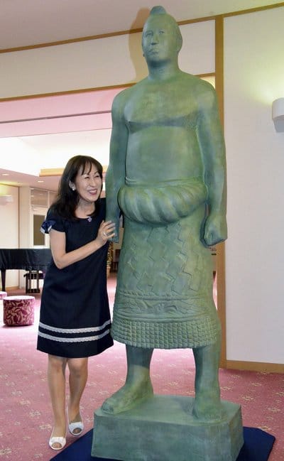 Taiho, une statue dans sa ville natale lui rend hommageLa femme de Taiho pose à côté de la statue de son mari