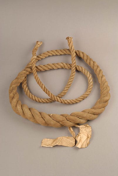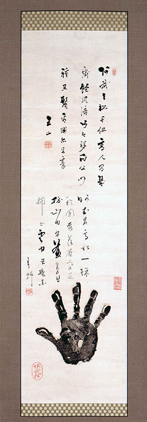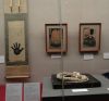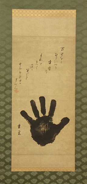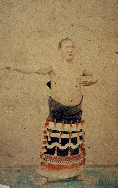Le premier yokozuna, Akashi Shiganosuke, a été immortalisé par des artistes comme Kuniteru II ou Toyokuni III qui ont fait des estampes magnifiques mettant en scène le champion, cependant les plus belles pièces de cette exposition sont surtout celles concernant Tanikaze (1750 – 1795). Les répliques de ses keshô mawashi mais aussi quelques-uns de ses effets personnels comme certains de ses vêtements (haori), son matériel de correspondance, son livre de poche, son bol de riz ou sa licence de yokozuna sont présentés au public. Cependant, les vraies pièces maîtresses qui retiendront le plus l’attention sont la tsuna que Tanikaze utilisait lors des cérémonies ainsi que l’arc qu’il a reçu des mains du shogun Tokugawa en personne qui récompensa le vainqueur du dernier combat en 1794. Sur une sorte de parchemin, le yokozuna a laissé ses empreintes : 23 cm pour la main et 32 cm pour son pied, des dimensions assez incroyables pour un homme qui ne mesurait « que » 1,88 m pour 160 kg !