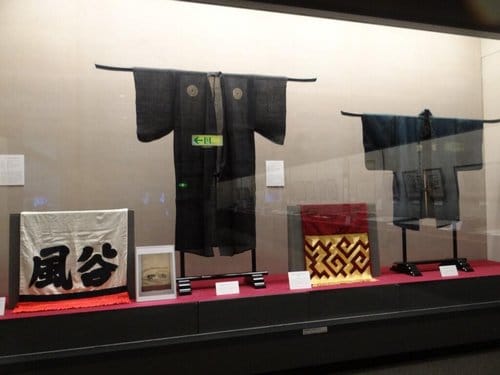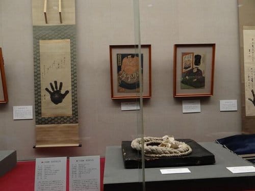 Raiden (1767 – 1825) est une véritable légende dans l’histoire de ce sport, avec un gabarit hors normes (surtout pour l’époque), 1,97 m pour 170 kg, son palmarès est aussi des plus impressionnants : en 22 ans de carrière, il a disputé 285 combats officiels pour un bilan de 254 victoires, 10 défaites et 21 nuls. Même si Raiden ne fût jamais yokozuna, il est celui qui a le plus haut niveau de réussite, rien que ça ! Le musée expose bien entendu des estampes représentant Raiden (qui fût le disciple du yokozuna Tanikaze), mais aussi plusieurs de ses affaires comme son oreiller, son kit de tabac, ses chaussures (tabi), ses ciseaux, son bol de riz et de thé, mais ce qui est le plus impressionnant est sans doute l’empreinte de sa main qui laisse imaginer la puissance de l’homme. On peut aussi y admirer quelques-uns de ses costumes (les dimensions donnent une idée de la montagne qu’il devait être) ainsi qu’un de ses kesho mawashi.